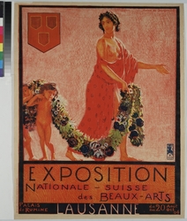 Description et mots-clés| Description :  | En noir, rouge et blanc sur fond multicolore, annonce de l'Exposition nationale suisse de Beaux-Arts à Lausanne, avec un dessin représentant une jeune femme vêtue d'une toge, portant une lourde guirlande de fleurs, assistée par deux enfants nus. Un blason stylisé complète l'affiche, où les tons rouge-orangé dominent. |