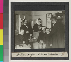 Description et mots-clésDescription : | Le Dr Marc Dufour examinant un enfant à sa consultation de l'Asile des Aveugle. D'autres patients attendent dans la pièce. Une infirmière se tient debout derrière. |